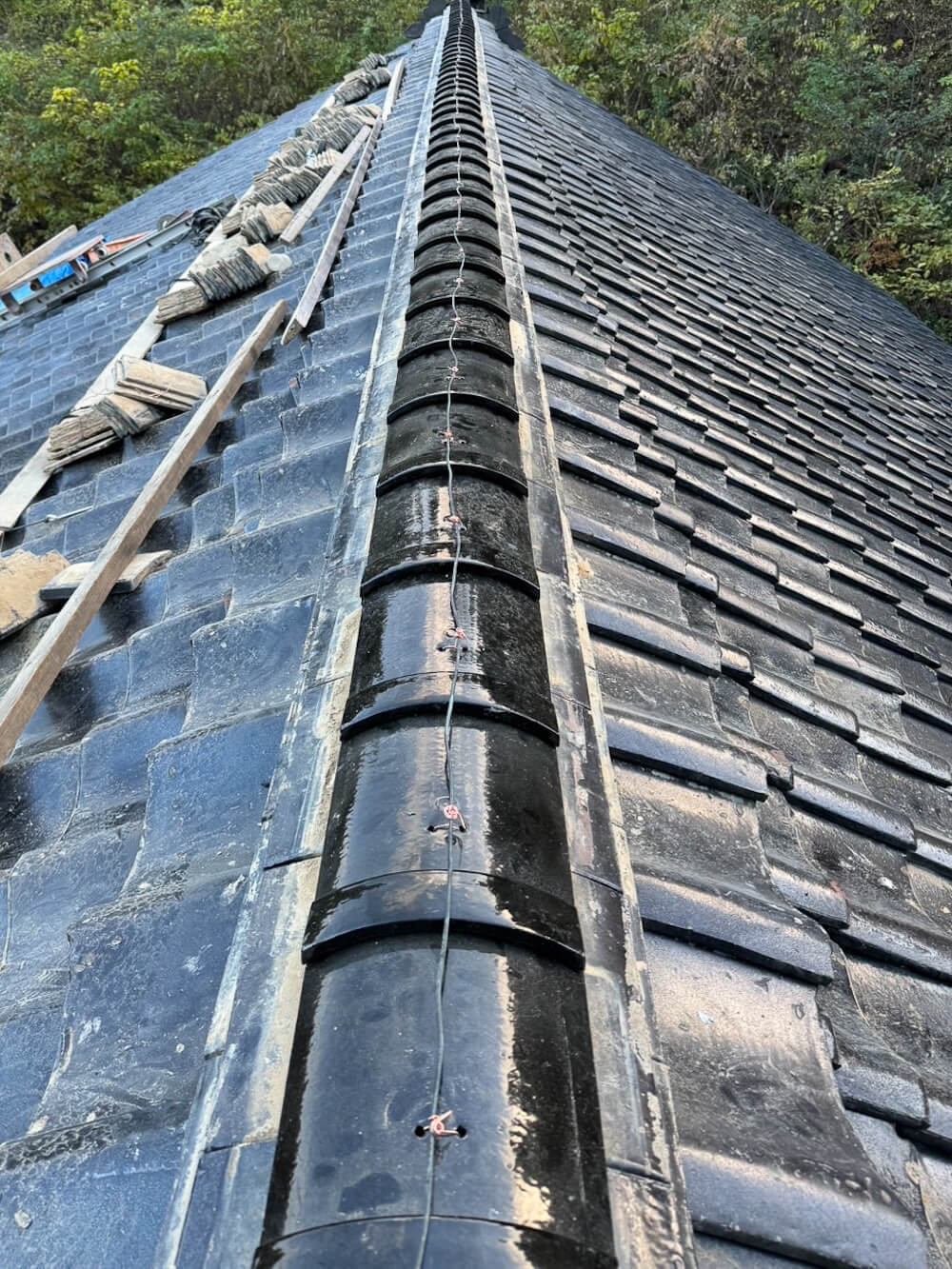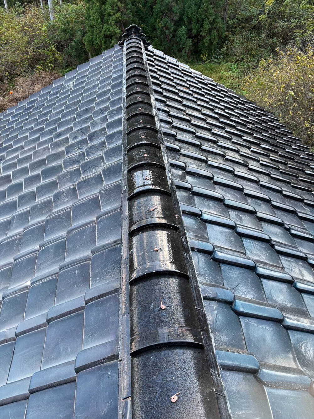 「能登半島地震から実家の瓦屋根にブルーシートをかぶせたままだったので、そろそろ直したいので見てほしい」とご相談を受けました。現地にお伺いした所、瓦屋根のてっぺん部にある瓦(棟瓦)がズレていました。他にも、瓦が落下している