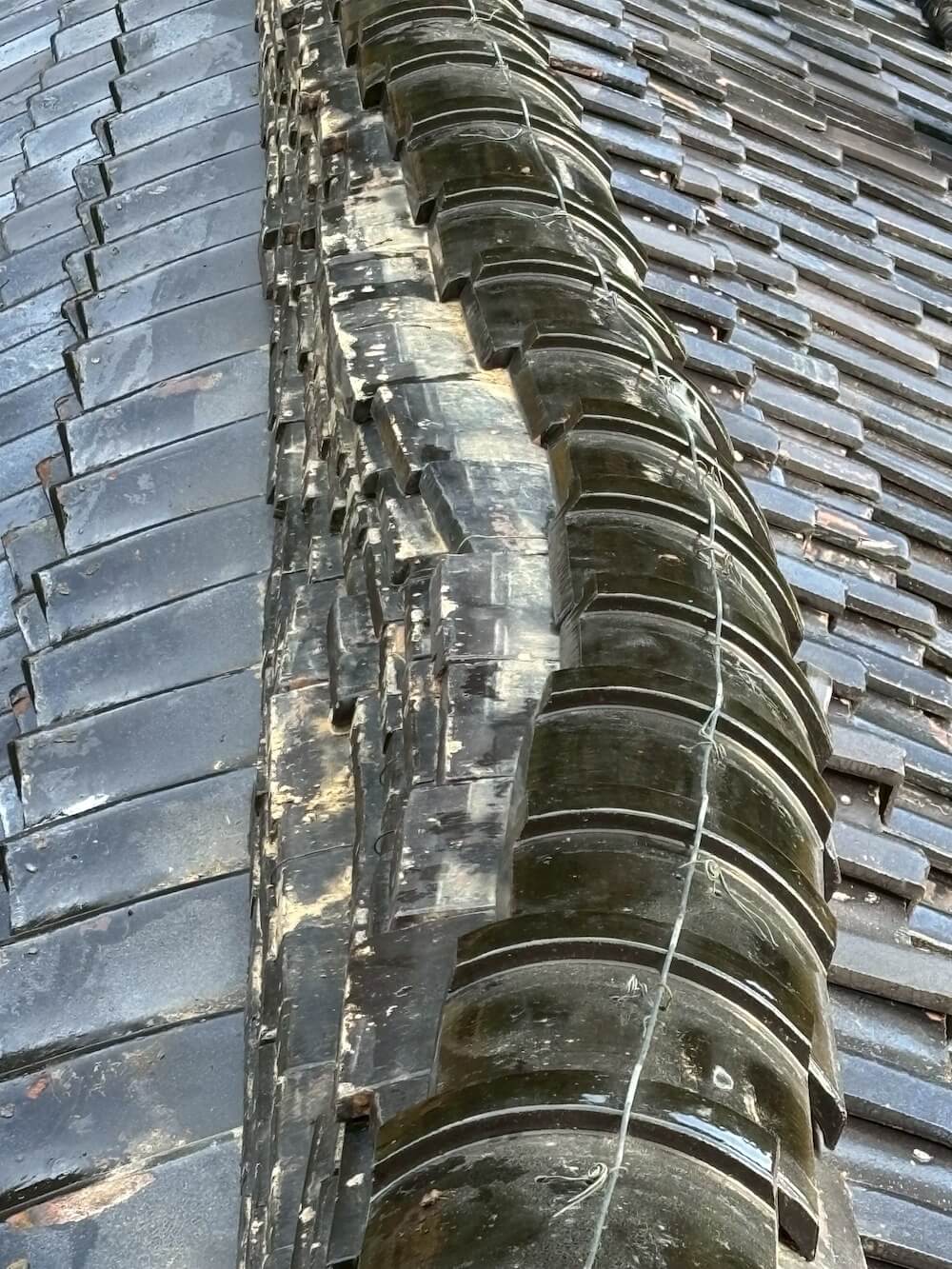 現地にお伺いした所、瓦屋根のてっぺん部にある瓦(棟瓦)がズレていました。