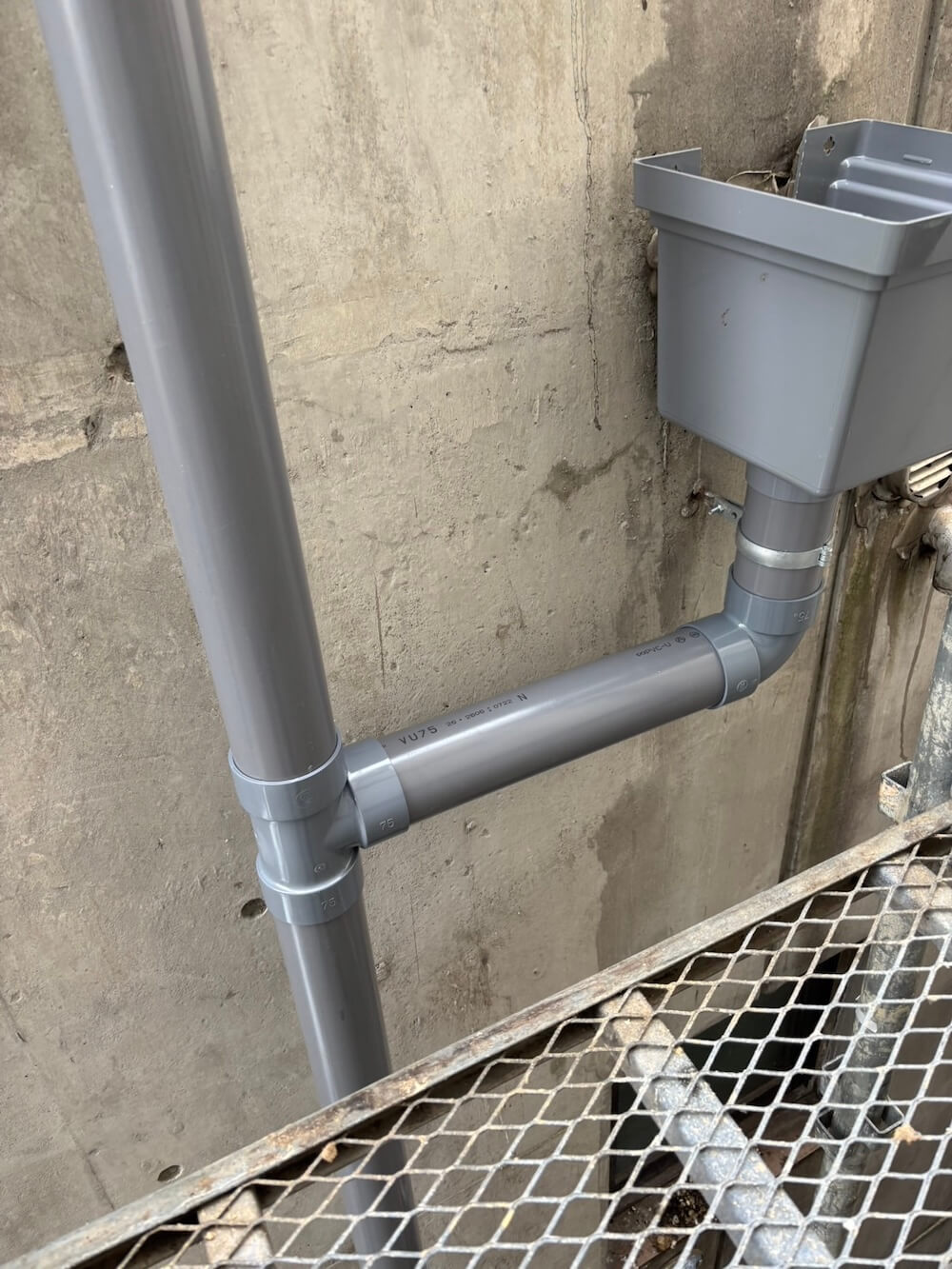 お客様より「雨樋のパイプが外れてしまっており、集水器からも水が落ちてきているのが気になる」とご相談を受けました。