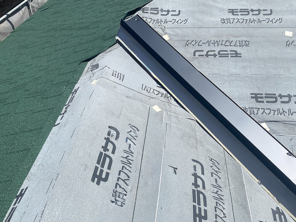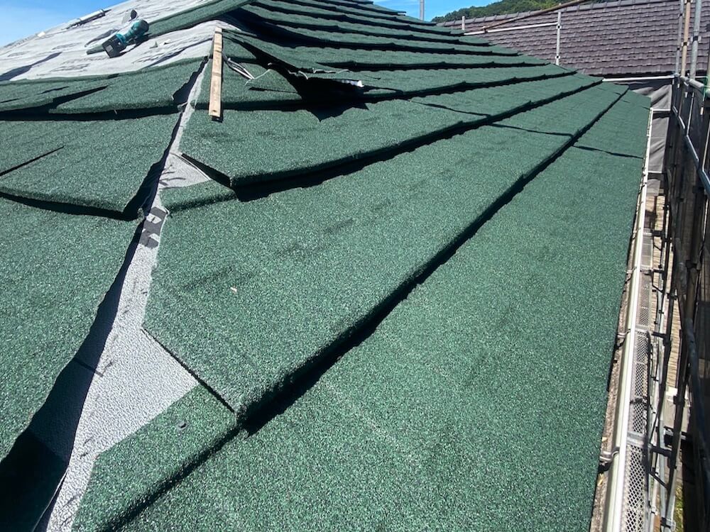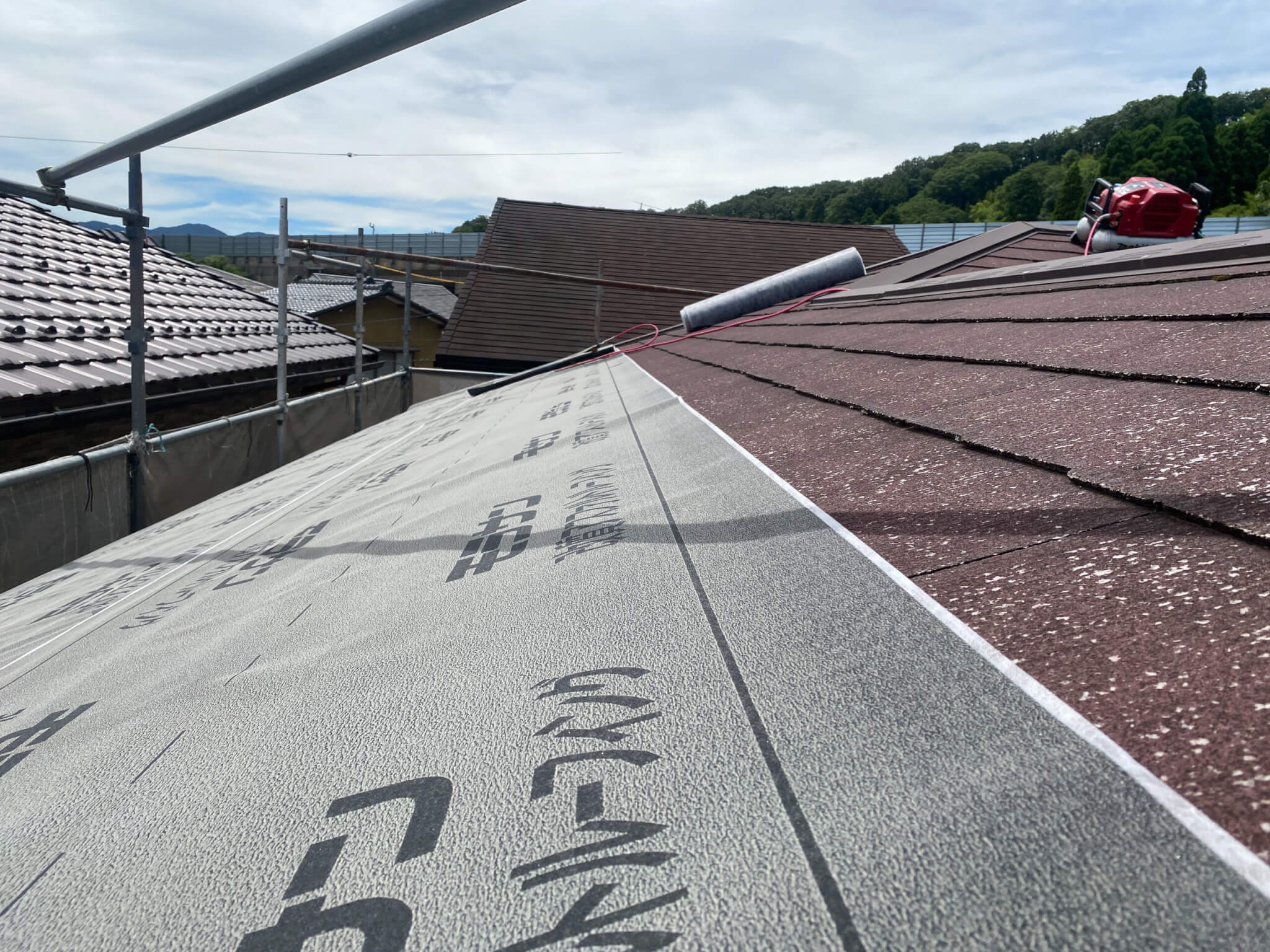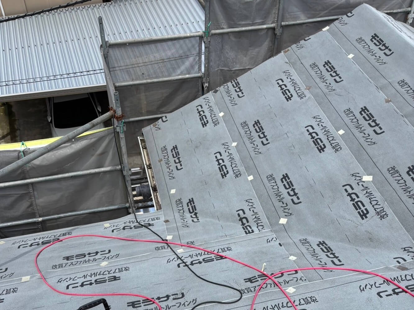 この工事は、既存の屋根材の上からルーフィング(防水紙)を葺き、新しい屋根材を重ねて葺く内容です。