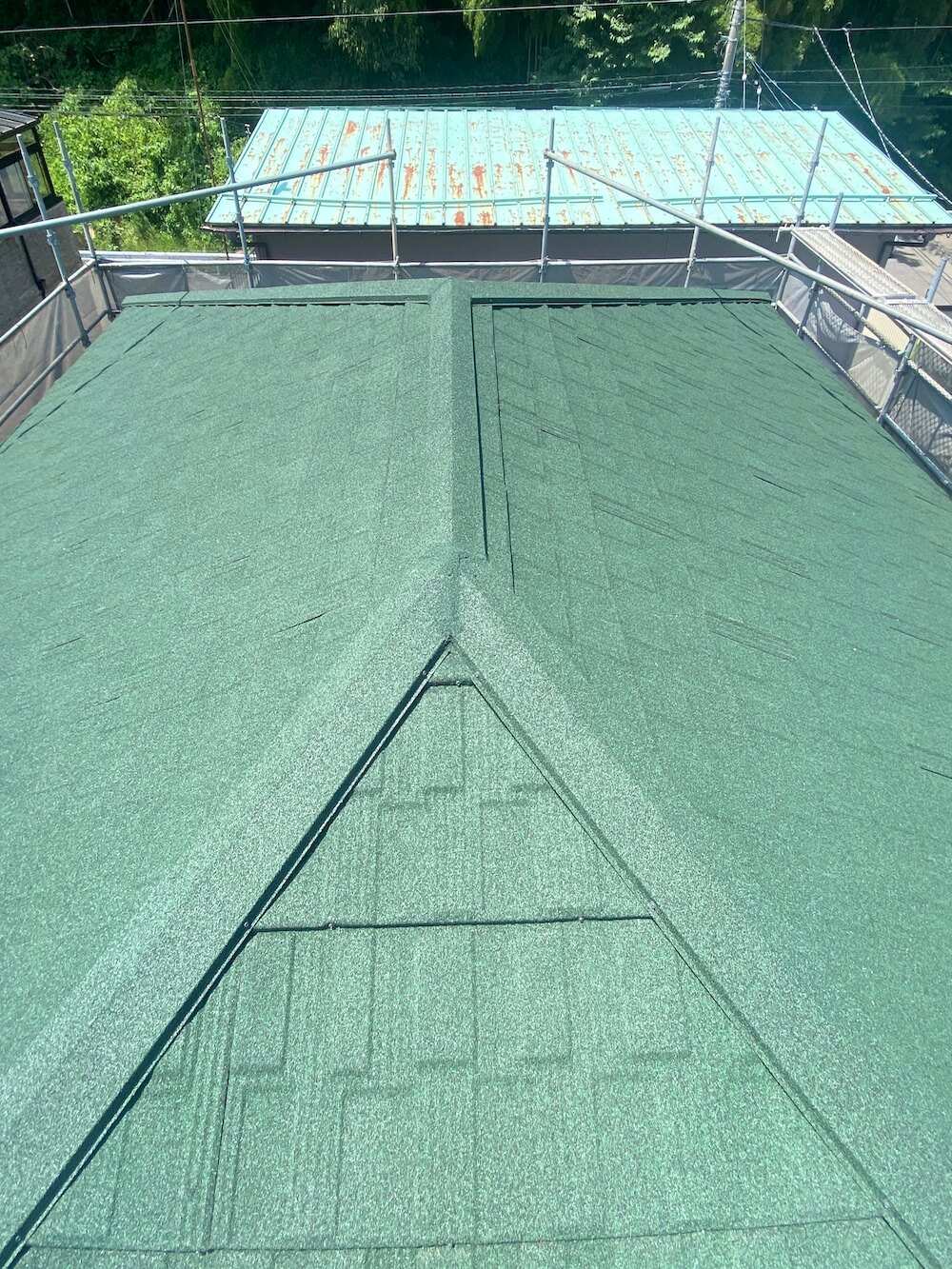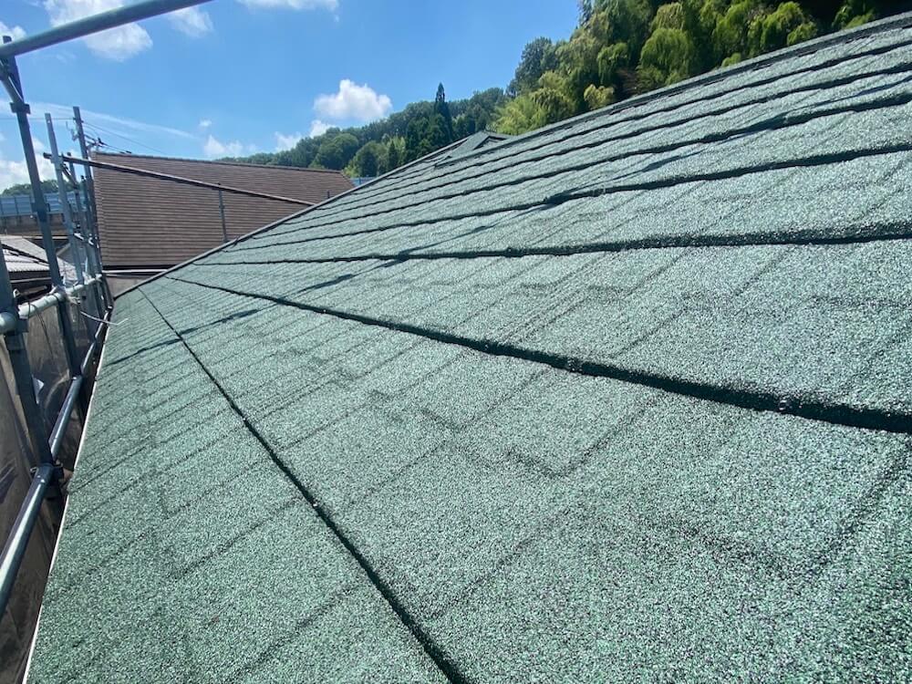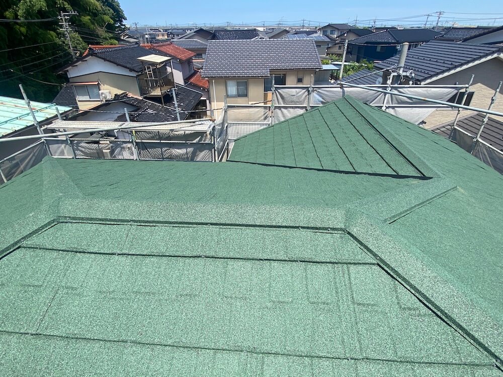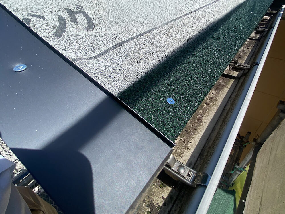 この工事は、既存の屋根材の上からルーフィング(防水紙)を葺き、新しい屋根材を重ねて葺く内容です。